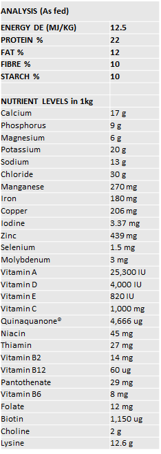 *Roughage (hay, chaff, grass hay, pasture, Beet Pulp etc) should be fed at 1-1.5% of bodyweight. Total daily feed (concentrate + roughage) should be 2-3% of bodyweight depending on age, workload, stage of pregnancy or lactation & climate. Feeding rates intended as a guide only. All variables should be taken into consideration.